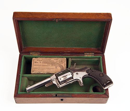 circa 1881, with octagonal 3in. barrel, crescent fore-sight, sighting groove to the top-strap, the top-strap signed 'HOPKINS & ALLEN MFG CO' together with patent dates to 1879 and 'XL No3 32 CAL RIM FIRE', blind fluted cylinder, plain solid frame, hard-rubber chequered grips with the 'dog's head' trademark and chequered sheath trigger, the whole retaining virtually all its original finish TOGETHER WITH an oak storage case, re-lined and compartmented for this pistol and containing a period original empty card ammunition carton