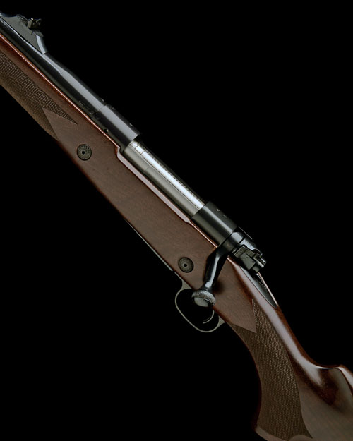 23 7/8in. nitro barrel with adjustable open sights, ramp-mounted bead fore-sight, left handed receiver and bolt, recoil blocks, hinged floorplate with push button release, pistolgrip stock with cheekpiece, sling eyes, 14 7/8in. pull including 1in. rubber recoil pad, in a universal case