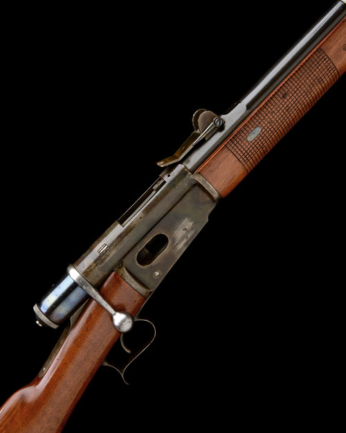 A WAFFENFABRIK BERN 10.4mm (SWISS) BOLT-ACTION REPEATING SERVICE RIFLE, MODEL 'M78', serial no. 135203, with 32 1/4in. blued barrel, block and blade fore-sight, tangent elevating rear-sight, blued action marked 'WAFFENFABRIK BERN' on the left side, walnut three-quarter stock with squared 'checking' to the fore-end, iron furniture and sling mounts, iron cleaning rod, the whole expertly refinished