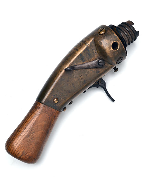 circa 1880, 14in. overall including coarse threaded front section designed to accept a dove-tailed base cartridge of approximately 1 1/2in. bore, bronze action body signed 'CONVERTED TO WM MOORE & GREYS IMPROVED PATENT BREECH LOADER No 2831', side lever cocking, long trigger-blade with aperture for rope release and bag-shaped walnut 'tiller'