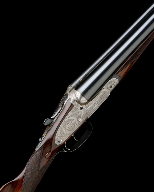 26in. replacement nitro barrels, the rib gold-inlaid '1' and with a flash of scroll engraving at the breech end (right wall thickness below recommended minimum), 2 1/2in. chambers, bored approx. imp. cyl. and 1/4 choke, treble-grip action with carved leaf fences, toplever gold-inlaid '1', automatic safety with gold-inlaid 'SAFE' detail, border and acanthus scroll engraving, brushed bright and reblued finish, 14 1/2in. figured stock including 1in. rubber recoil pad, weight 6lb. 4oz.