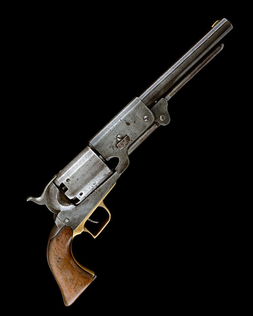 Belgian circa 1920, being a copy of a Colt Walker deliberately made to deceive, with 9in. barrel, slab-sided breech, the top signed ' ADDRESS COLT' and 'NEW-YORK CITY', (some other words missing, the whole rubbed), left hand side of breech with feint 'COMPANY B 28', the right hand side with 'US' over '1847' (obscured by take down wedge securing screw), plain cylinder with roll-engraved scene, round locking notches, plain unsigned iron frame, iron back-strap, one piece flared walnut grip, brass square-backed trigger-guard and hinged under-barrel rammer