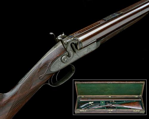 circa 1855, with re-browned 31in. damascus barrels, matted top-rib signed near breech 'I. HOLLIS & SONS, LONDON' (refreshed), dove-tailed blade fore-sight, express rear-sight with four folding leaves, colour-hardened scroll engraved breech-block (colour renewed), long scroll engraved top-tang, border and scroll engraved bar-action locks signed 'I HOLLIS & SONS', carved and scroll engraved hammers, chequered walnut half-stock, iron furniture, white metal oval escutcheon to the underside of butt, the whole refinished throughout TOGETHER WITH a stained oak storage case compartmented and re-lined in green baize and including a number of accessories including a signed 'Whitworth' bullet mould, a powder and a shot flask