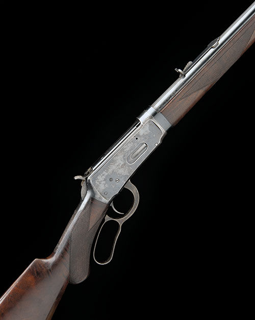 for 1895, with 26in. round barrel, matted top-surface, the left-hand side of barrel signed 'MANUFACTURED BY THE WINCHESTER REPEATING ARMS CO, NEW HAVEN CONN' , dove-tailed fore-sight (missing), buckhorn rear-sight with adjustable blade, blued receiver, the top-tang drilled for peep-sight, the tapped holes with keeper screws, stamped with 'MODEL 1894 WINCHESTER PAT. AUG. 21 1894', highly figured walnut chequered pistol-grip butt-stock, hard-rubber pistol-grip cap embossed with 'WINCHESTER REPEATING ARMS CO', hard-rubber chequered 'shotgun' butt-plate with central Winchester trademark, figured walnut chequered fore-end, blued nose-cap, three-quarter length under-barrel magazine with take-down lever, the whole being an early, probably factory refinish