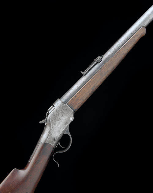 for 1887, with 29 7/8in. round barrel, the top of barrel signed 'MANUFACTURED BY THE WINCHESTER REPEATING ARMS CO, NEW HAVEN CONN', dove-tailed blade fore-sight, elevating ladder rear-sight with additional standing notch, falling block receiver with central hammer, the top-tang drilled for peep-sight, the tapped hole with keeper screw, no model designation, straight-hand walnut butt-stock, iron 'shotgun' butt-plate and walnut splinter fore-end with horn inlay at the schnabel tip
