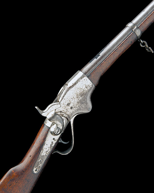circa 1863-65, with round 22in. barrel, missing fore-sight blade and rear-sight, nickel-plated receiver with under-lever opening, the top of receiver stamped 'SPENCER REPEATING RIFLE CO. BOSTON, MASS, PAT'D MARCH 6 1860', nickel-plated back-action sidelock with external hammer, saddle-ring and bar to left hand side, walnut straight-hand butt-stock with magazine tube concealed in the iron heel-plate, walnut splinter fore-end and iron barrel-band with swivel, traces of finish, the plating later