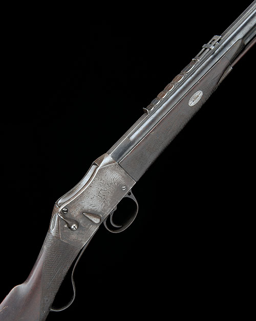 circa 1895, with round 28 1/4in. barrel, full-length matted sighting rib signed 'MADE FOR M. STAHD & CO MIDDELBURG, ROBERT HUGHES & SONS, LONDON & BIRMINGHAM', dove-tailed bead fore-sight, express rear-sight with six folding leaves, additional elevating ladder and standing notch, receiver with matted top, the sides with border engraved panels featuring lions in naturalistic settings, chequered walnut straight-hand butt-stock stamped 'J.H.L.' on both sides, iron heel-plate with central trapdoor, under-lever with chequered grip, chequered walnut splinter fore-end with horn tip and iron clearing rod throat and under-barrel rib with thimbles for the brass-tipped wood clearing rod