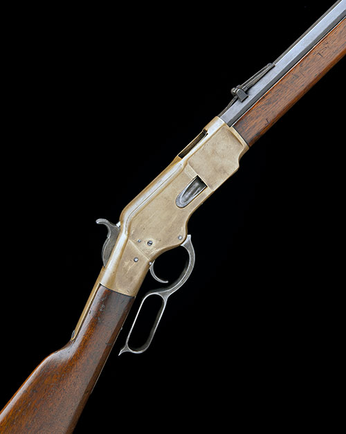 for 1870, with 22 3/4in. octagonal barrel (possibly shortened), the top-flat signed 'WINCHESTER'S REPEATING ARMS, NEW HAVEN CT' over 'KINGS-IMPROVEMENT-PATENTED-MARCH 29 1866 OCTOBER 16 1860', dove-tailed blade fore-sight, elevating ladder rear-sight, bronze open-topped receiver, no provision for peep-sight or model designation stamp, walnut straight hand butt-stock, carbine style brass butt-plate with central sliding trapdoor, small sized finger-loop to underlever (locking latch missing), walnut fore-end, brass nose-cap, full length under-barrel magazine and provision for swivels (front missing)