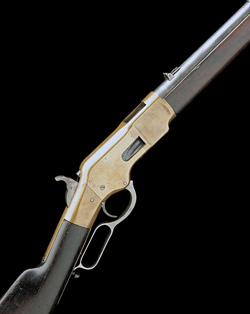 for 1871, with 20in. round barrel, the top signed 'WINCHESTER'S REPEATING ARMS, NEW HAVEN CT' over 'KINGS-IMPROVEMENT-PATENTED-MARCH 29 1866 OCTOBER 16 1860' (faint and rubbed), blade fore-sight on the front barrel-band, folding ladder rear-sight, bronze open-topped receiver, no provision for peep-sight or model designation stamp, walnut straight hand butt-stock, carbine style brass butt-plate with central sliding trapdoor, the interior cavity containing the original take-down cleaning rod, small sized finger-loop to underlever, walnut fore-end with barrel band, full length under-barrel magazine and saddle-ring to left hand side of receiver
