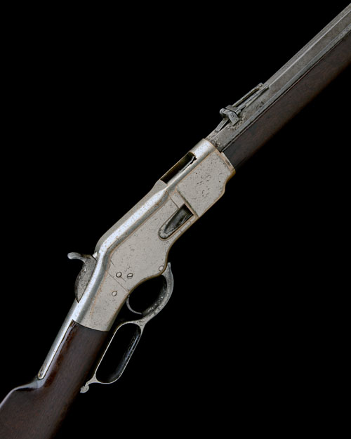 for 1876, with nickel-plated 24 1/4in. octagonal barrel, the top-flat signed 'WINCHESTER'S REPEATING ARMS, NEW HAVEN CT' over 'KINGS-IMPROVEMENT-PATENTED-MARCH 29 1866 OCTOBER 16 1860', dove-tailed blade fore-sight, elevating ladder rear-sight, nickel-plated bronze open-topped receiver, no provision for peep-sight or model designation stamp, walnut straight hand butt-stock, crescent style brass butt-plate (traces of nickel plate) with central sprung trapdoor, the cavity containing the original take-down cleaning rod, larger sized finger-loop to underlever, walnut fore-end, nickel-plated brass nose-cap and full length under-barrel magazine, fitted with swivels, a good proportion of the original factory nickel-plating remaining