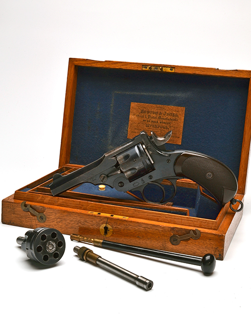 commercial example circa 1895, with blued 4in. sighted barrel, the top-strap signed 'HOOTON & JONES 60 DALE ST LIVERPOOL', blued fluted cylinder, blued break-open frame marked 'WEBLEY PATENTS', broad hammer-spur, chequered hard-rubber birdshead grips with lanyard ring to butt, the back-strap engraved 'CAPT. T.T. VERNON', the whole remaining in fine order with little signs of use, COMPLETE WITH its factory fitted detachable .297-230 Morris-tube adaptor training unit comprising of a stepped and fluted cylinder with a barrel insert and TOGETHER WITH its retailers oak storage case with Hooton & Jones parchment label to inside of lid, the interior lined and compartmented in blue baize to accommodate the revolver, the conversion kit and sundry tools, the outer lid with circular brass escutcheon engraved 'CAPT. T.T. VERNON LIVERPOOL'.