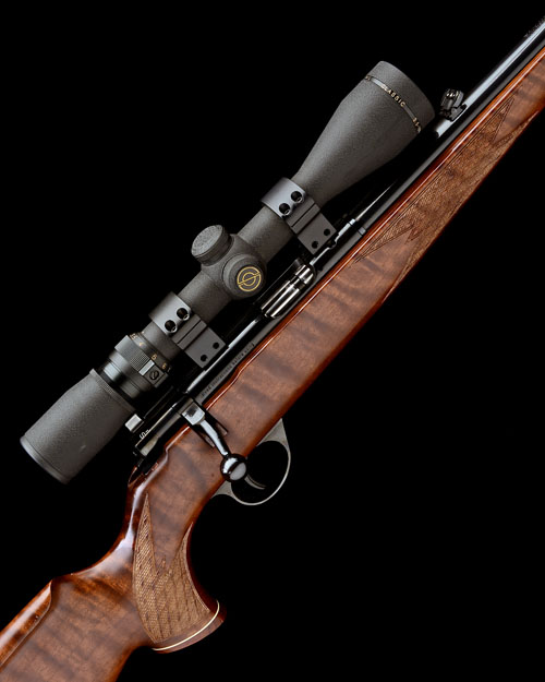 23 1/2in. nitro barrel threaded for a sound moderator, with covered ramp-mounted bead fore-sight, flip-up rear sight, fitted with a laser point in a 'Beamshot' mount, the receiver fitted with a Simmons 'Whitetail Classic' telescopic sight, leather sling, figured pistolgrip stock with schnabel fore-end, chequered at the grip and fore-end, pistolgrip with wooden birdshead pistolgrip cap, cheekpiece with raised comb, weight 8lb. 8oz., 14in. pull including buttplate, in a universal case, together with 2 spare magazines (3 in total), and a Deben Walker lamping lamp with spare red filter, in a blue velveteen box