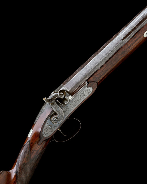 circa 1845, with triple-staged damascus 31 1/4in. barrel banded at the intersection, the top-flat near breech signed in script 'WESTLEY RICHARDS', colour hardened squared patent breech with twin platinum lines, fenced nipple with platinum vented plug, fully scroll engraved top-tang incorporating a shallow notch rear-sight, colour hardened bar-action border and scroll engraved lock signed 'WESTLEY RICHARDS', scroll engraved dolphin-headed hammer (spur broken off), walnut half-stock chequered at the wrist, clipped corner rectangular silver escutcheon behind top-tang, iron heel-plate with scroll engraved long top-spur, scroll engraved trigger-guard tang and bow, shell engraved ball finial, oval silver take-down wedge escutcheons, iron ramrod throat and original brass-mounted ramrod, strong traces of original finish and colour throughout