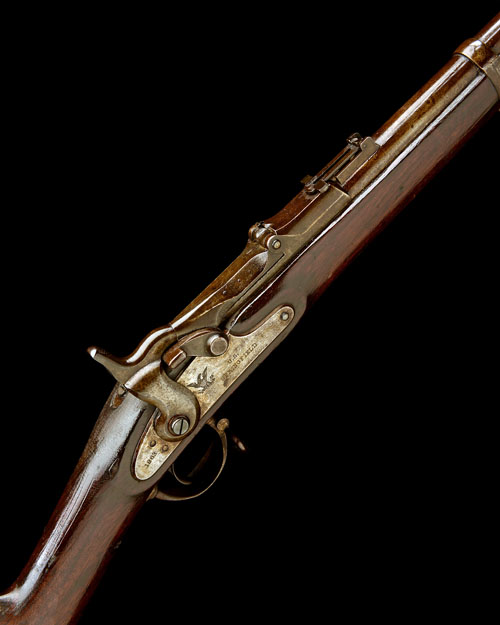 circa 1870, with round 32 1/2in. barrel, block and blade fore-sight, elevating ladder rear-sight, flip-open breech-block with side release catch, the top of block stamped '1869' and 'U.S.' with an eagles head and crossed arrows, bar-action lock with bevel-edges signed 'SPRINGFIELD' over 'U.S.' marked with an American eagle and dated '1863' at the tail, walnut straight-hand full-stock, iron furniture and under-barrel iron clearing rod