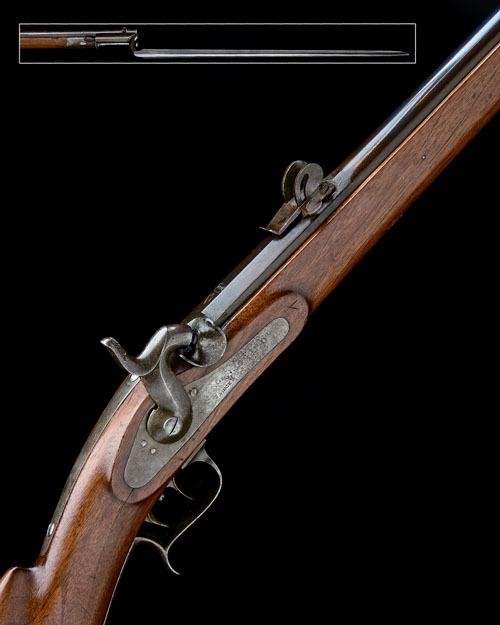 made for the Swiss market circa 1860, with round 33in. rifled barrel, dove-tailed blade fore-sight, elevating tangent rear-sight with wing-nut lock, plain elongated colour-hardened top-tang, plain hump-back lock signed 'BEURET FRERES LIEGE', plain walnut full-stock with 'roman-nose' comb, heavy iron hooked butt-plate, re-inforced trigger-guard tang, double-set triggers, finger-spur to the trigger-guard bow, iron roll-tipped nose-cap, iron under-barrel ram-rod with captive sliding ball-guides, socket to the right hand side of muzzle and iron sling swivels, TOGETHER WITH its seldom encountered iron, concave triangular cross-section bayonet.