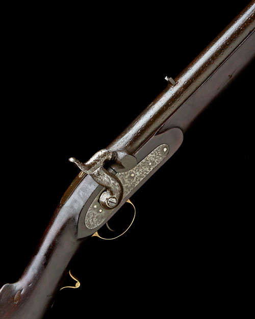 circa 1840, possibly experimental and loosely based on the Pattern '39 musket, with heavy round 30in. barrel, bead fore-sight, standing notch rear-sight, the breech signed 'C. GREVILLE HARSTON & CO, MAKERS, BIRMINGHAM' together with a running fox trademark, plain bar-action lock with ordnance acceptance stamps, walnut three-quarter stock with raised cheek-piece, brass furniture including pistol-grip trigger-guard tang, side-nail cups, ramrod thimbles and nose-cap, plain iron under-barrel ramrod and iron swivels, some pitting, mainly to barrel surface
