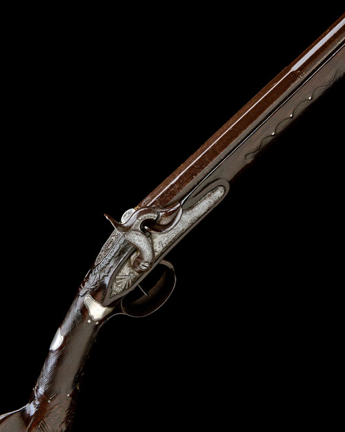 circa 1785 with later conversion to percussion, with 32in. triple-stage barrel, silver boat-shaped fore-sight on a gilded ground, further traces of gilding to the various barrel-flats, deeply struck makers mark at breech being a crown over 'H.R.' within an oval, eared rear-sight to the scroll engraved top-tang, curved and radiused plain lockplate signed in script 'AUMONT A PARIS' with carved shell to tail, plain hammer, walnut half-pistol full-stock with rococco bordered chequered panels to the wrist and fore-end, the grip carved in imitation of a sea monster, iron cap-style heel-plate engraved with shells and swags, silver panels inlayed to wrist, the chequered panel bordered with inlayed silver stars, further silver stars inlayed to both sides of butt and along the fore-end (an inlay of a crescent moon and the take-down wedge escutcheons missing), inlay of a running snake to underside of butt, iron pillar and shell trigger-guard bow, vase finial, carved iron ramrod pipes and replacement wood ramrod