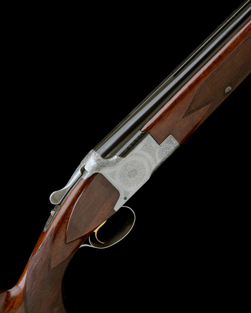 26in. nitro barrels with 9mm ventilated matt top-rib, 2 3/4in. chambers, bored approx. true cyl. in both, hold-open toplever, manual safety with integral barrel selector switch, gold-washed single-trigger, floral acanthus scroll engraving, silver finish, 14 1/4in. pistolgrip stock including 1 1/4in. extension, weight 7lb. 6oz.