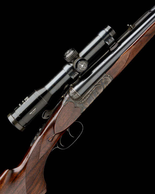 cat. no. 7562, 23 3/4in. nitro barrels with matt sight rib, open sights and ramp-mounted bead fore-sight with flip-up moonsight, the breech end mounted with a K. Kahles Helia S 2,5x20 telescopic sight in quickly-detachable mounts, tubes engraved 'P. ZANARDINI - GARDONE V.T.', CONSTRUITO APPOSITAMENTE PER IMPERATORI STELLUTI CESI GIULIANO AUGUSTO - ROMA', scroll-back action with side-bolsters, toplever pierced with a running wild boar, manual safety, fences deeply carved with scroll motifs, retaining virtually full colour-hardened and blued finish, 14 5/8in. figured pistolgrip stock with cheekpiece, sling swivels, hinged steel ammunition trap and including 1in. rubber recoil pad, beavertail fore-end with Deeley & Edge patent release catch, weight 9lb. 6oz.