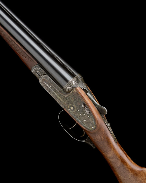 28in. nitro chopperlump barrels, 2 3/4in. chambers, bored approx. 1/4 and 1/2 choke, engraved arcaded fences, removable striker discs, automatic safety, hand-detachable lockplates, gold-inlaid cocking-indicators, rolled-edge triggerguard, acanthus scroll engraving, retaining some original colour-hardening and finish, 14 1/4in. unchequered replacement stock, weight 6lb.