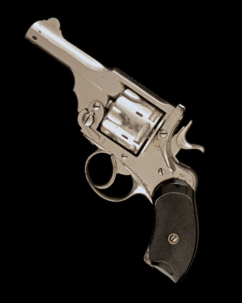 circa 1903, with 3in. barrel, the top-strap signed 'P. WEBLEY & SON LONDON & BIRMINGHAM', fluted cylinder, frame with 'WEBLEY PATENTS' and the 'winged bullet' logo, flat-faced hammer with disc-set striker in frame, black hard-rubber chequered grips (one chipped at heel), the whole retaining the majority of its original nickel finish