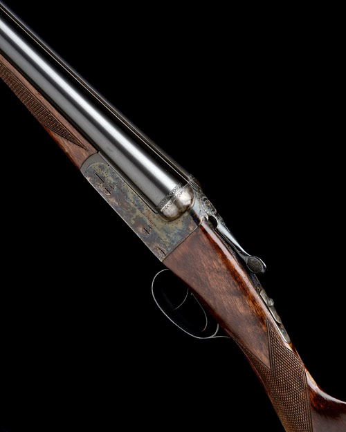 27in. nitro barrels, 2 3/4in. chambers, bored approx. 1/4 and 3/4 choke, automatic safety with gold-inlaid 'S' detail, border engraving, retaining virtually full original colour-hardening and finish, 14in. stock, weight 5lb. 9oz.