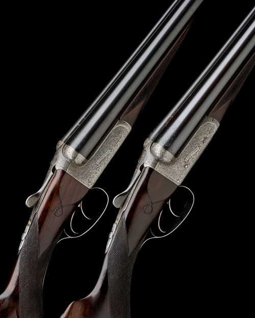 25in. nitro reproved barrels with matt ribs gold-inlaid 'XXV', '1' and '2', the tubes engraved with hastate flashes of acanthus scrollwork and 'E.J. CHURCHILL (GUNMAKER) LTD. 8 AGAR STREET. STRAND. LONDON. W.C.2.', 2 1/2in. chambers, bored approx. imp. cyl. and 1/4 choke (both), treble-grip actions with hidden third bites, toplevers gold-inlaid '1' and '2', automatic safeties with gold-inlaid 'SAFE' details, fully engraved with fine acanthus scrollwork with scrolling borders, the undersides engraved 'HERCULES FINEST QUALITY MODEL' and gold-inlaid 'XXV', the fore-end finials gold-inlaid '1' and '2', retaining traces of original colour-hardening and finish, 15 1/2in. figured semi-pistolgrip stocks (slightly swept) including 2in. wooden extensions, weight 6lb. 5oz. (No.1) 6lb. 4oz. (No.2), in their makers lightweight leather double motorcase