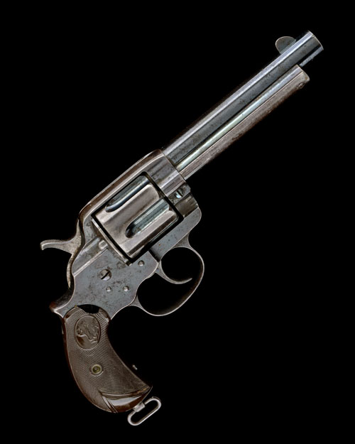 for 1892, with blued 5 1/2in. barrel signed 'COLT'S PT FA MFG CO HARTFORD CT USA DEPOT 14 PALL MALL LONDON', the left side of barrel stamped '.455 CAL', blade fore-sight, narrowed sighting channel to the top-strap, plain frame with loading gate, chequered hard-rubber birdshead grips (small losses to both), lanyard ring to heel, guarded trigger and spring loaded under-barrel ejector rod, a good amount of original blued finish remaining