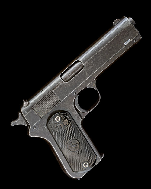 for 1916, with 4 1/2in. barrel, sighted slide marked on the right hand side 'AUTOMATIC COLT' over 'CALIBRE 38 RIMLESS SMOKELESS', the left hand side marked 'PATENTED APR 20. 1897, SEPT 9. 1902' together with the makers details and address, plain frame, chequered hard-rubber grips embossed 'COLT' together with the Colt trademark, magazine release to heel, blued trigger, traces of original finish remaining with some mild pitting
