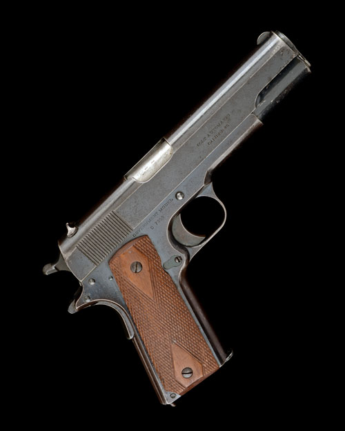 for 1914, with 5in. barrel, blued, sighted slide marked with Colt's address details and patents to 1913, blued frame, grip-safe and straight back-strap, chequered walnut grips with diamond-shaped blank panels top and bottom, lanyard loop to heel, the whole retaining much original finish