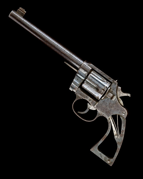 * A SCARCE .455 (ELEY) SIX-SHOT DOUBLE-ACTION REVOLVER, SIGNED COLT, MODEL 'NEW SERVICE SHOOTING MASTER TARGET', serial no. 13680, for 1905, with round 7 1/2in. barrel signed 'COLT'S PATENT FIRE ARMS MANUFACTURING CO HARTFORD CT USA PAT AUG 5 1884 JUNE 5 1900', marked 'NEW SERVICE and '455 ELEY' on the left of barrel, block and blade fore-sight, drift adjustable notch rear-sight to rear of the flat top-strap, fluted swing-out cylinder, plain frame marked 'COLT'S NEW SERVICE' in a circle with the Colt trademark to the left hand side, chequered front and back-straps (grips missing), chequered trigger-blade and good traces of blued finish throughout with some mild bruising to metal (tip of ejector rod missing, firing pin bush absent)