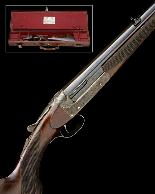 26in. octagonal barrel, the top flat file cut at the muzzle and breech, with bead fore-sight, rear open sights, engraved 'HOLLAND & HOLLAND. 98. NEW BOND ST. LONDON.' and 'WINNER OF ALL THE "FIELD" RIFLE TRIALS. 300 LONG SHERWOOD.', the breech end engraved with flashes of acanthus scroll at each face, the shoulders engraved en suite, non-selective ejector, the action with carved teardrop fences, removable striker disc, automatic safety with gold-inlaid 'SAFE' detail, 'Royal' scroll engraving, retaining some original colour-hardening and finish, 14 1/2in. figured pistolgrip stock with engraved steel pistogrip cap, cheekpiece, including buttplate, in its tan leather case