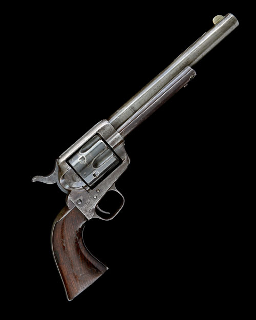 for 1874, with round 7 1/2in. barrel signed 'COLT'S PT F A MFG CO HARTFORD CT USA', nickel blade fore-sight, sighting groove to the top-strap, fluted cylinder, plain frame with front mounted cylinder retaining screw and two line patent details, iron trigger-guard and grip-straps, the heel amateurly engraved 'J. QUINLAN', walnut one-piece grip and under-barrel spring-loaded ejector rod with 'bullseye' thumb-piece, refinished and rubbed throughout