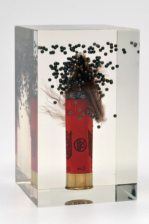 A PAPER-WEIGHT OF AN OPENED 12-BORE 'FUSILADE 5' PAPER CARTRIDGE WITH SHOT STRING,