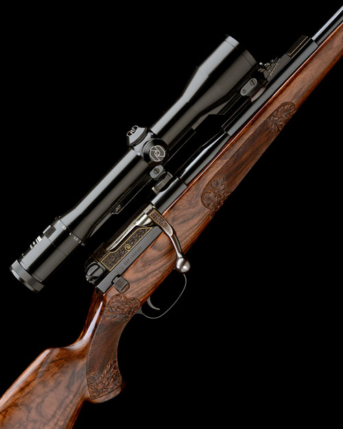 25 3/4in. nitro barrel with adjustable open sights, ramp-mounted blade fore-sight, mounted with a Zeiss Diavari-Z 1,5...6x42 telescopic sight in quickly-detachable mounts, sliding bolt houseing and bolt handle with fine scroll engraving with gold highlights, highly-figured pistolgrip stock with sculpted cheekpiece, the hand and fore-end carved in relief with oak leaves and acorns, pistolgrip-cap, horn schnabel fore-end finial, sling swivels, 14in. pull including 7/8in. ventilated rubber recoil pad