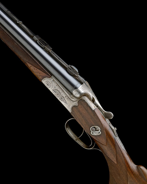 23 5/8in. nitro reproved barrels with raised matt rib, flip-up open sights, bead fore-sight, the breech end with quickly-detachable telescopic sight mount bases, 2 3/4in. shot chambers, bored approx. 3/4 and full choke, scroll-back treble-grip action with side-clips and side-bolsters, cocking-indicators, tang mounted shot / ball selector switch, manual side safety, set front trigger, border and scroll engraving, bright finish, 15in. pistolgrip stock with cheekpiece, hogsback comb, pistolgrip-cap, sling swivels, weight 7lb. 12oz.