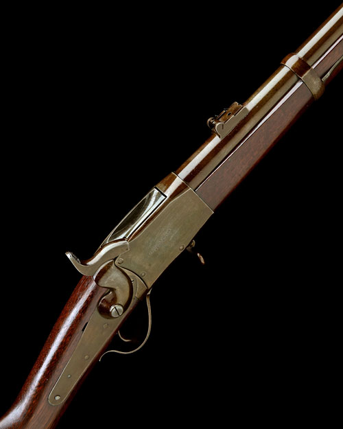 circa 1866, with 36in. blued sighted barrel (faded), case-hardened action marked 'PEABODY'S PAT. / JULY. 22. 1862' on the left side and 'MAN'F'D BY / PROVIDENCE TOOL CO. / PROV. R.I.' on the right side, back-action lock, walnut three-quarter stock, iron furniture including three sprung barrel-bands, iron sling mounts and iron cleaning rod