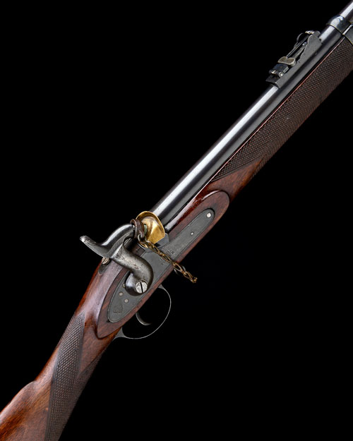dated for 1860, with 33in. reblued barrel, the the top signed 'JEFFERY GUILDFORD', block and blade fore-sight, elevating ladder rear-sight graduated to 1100 yds., additional brass flash-guard around the nipple, borderline engraved and dated military lock signed 'TOWER' with a Victorian crown to the tail, walnut three-quarter stock with iron furniture, chequered at the wrist and fore-end, chained nipple protector and iron under-barrel ramrod
