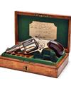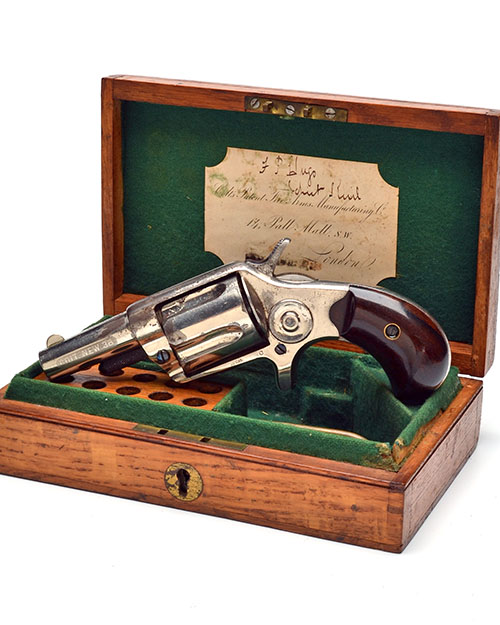 circa 1880, with round tapering 2 1/4in. barrel signed in two lines 'COLT'S PT FA MFG CO HARTFORD CT USA', 1874 patent stamped to underside of barrel, etched panel with 'COLT NEW 38' to left hand side of barrel, crescent fore-sight, sighting groove to the top-strap, fluted cylinder, solid frame, blued hammer with polished sides, smooth rosewood birdshead grips and sheath trigger, some flaking and loss to finish, COMPLETE WITH its probable original English market oak storage case, indented corner parchment trade-label with the Depot 14 Pall Mall address, compartmented and lined in green baize, complete with a cleaning rod and provision for ammunition