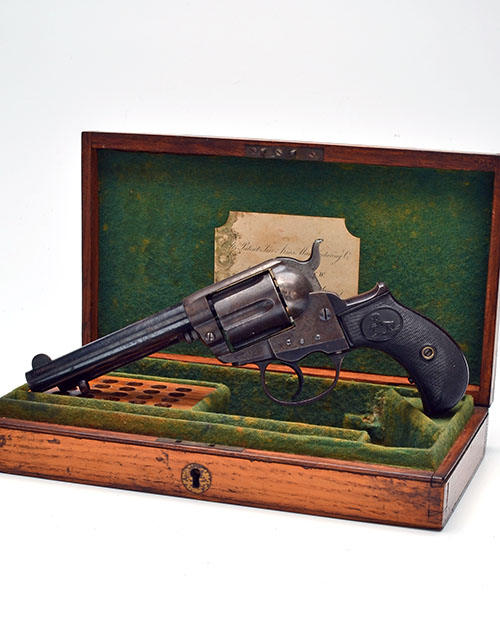 for 1888, with round tapering 4 1/2in. barrel, the top signed 'COLTS PT FA MFG CO HARTFORD CT USA', blued crescent fore-sight, sighting groove to the top-strap, fluted cylinder, plain frame with loading gate to the right hand side, chequered hard-rubber birdshead grip with the Colt trademark and guarded trigger, much original blued finish, the action colour stained, COMPLETE WITH its probable original English market oak storage case, indented corner parchment trade-label with the Depot 14 Pall Mall address, compartmented and lined in green baize, complete with a case key and provision for ammunition
