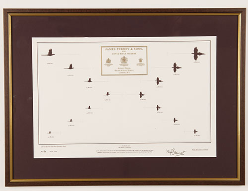 no. 90 of 100, central gold embossed Purdey trade label, surrounded by scale illustrations of pheasant in flight with apposite distances, with explanatory note: 'AT ONE ARM'S LENGTH, THE SIZE OF THE BIRD ON THE PRINT IS AS IT WOULD IN REALITY AT THE INDICATED DISTANCE. MEMORISE THE SILHOUETTES IN ORDER TO BETTER JUDGE THE LEAD AND THE DISTANCE IN REAL SHOOTING SITUATION'