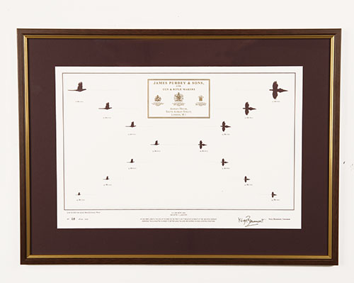 no. 90 of 100, central gold embossed Purdey trade label, surrounded by scale illustrations of pheasant in flight with apposite distances, with explanatory note: 'AT ONE ARM'S LENGTH, THE SIZE OF THE BIRD ON THE PRINT IS AS IT WOULD IN REALITY AT THE INDICATED DISTANCE. MEMORISE THE SILHOUETTES IN ORDER TO BETTER JUDGE THE LEAD AND THE DISTANCE IN REAL SHOOTING SITUATION'