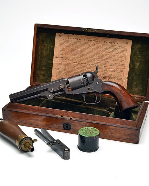 for 1855, with 5in. octagonal barrel, the top-flat signed 'ADDRESS COL COLT LONDON' surrounded by brackets with arabesque terminals, bead fore-sight, plain cylinder with roll-engraved 'stagecoach hold-up' scene, open iron frame, iron grip-straps and trigger-guard, one-piece smooth walnut grip and articulated under-barrel rammer COMPLETE WITH an English market oak storage case, compartmented and lined in green velvet, parchment instruction label to inside of lid and containing an English bag-shape powder flask, an iron scissors bullet mold signed 'COLT' PATENT' and a tin of 'ELEY' percussion caps