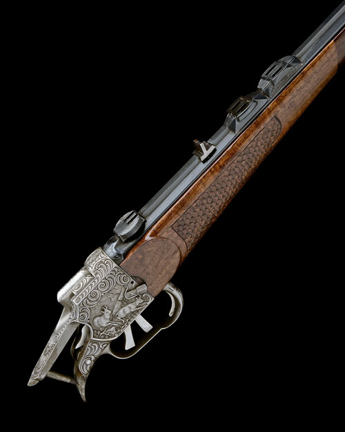 26 1/8in. octagonal nitro barrel with open sights, ramp-mounted blade fore-sight, raised matt rib with three quickly-detachable telescopic sight claw mount bases, action deeply carved in relief with woodland scenes of roe deer and chamois, manual side safety, old silver finish, fore-end with schnabel finial and fishscale chequering, missing stock