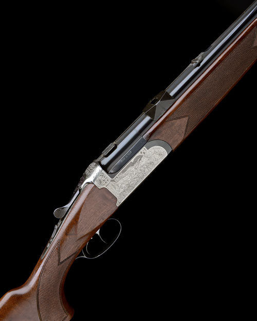 25 1/2in. nitro barrels with matt sight rib, flip-up open sights, ramped bead fore-sight, the breech end with quickly-detachable telescopic sight mount bases, 2 3/4in. shot chamber, bored approx. full choke, hold-open toplever, manual safety, set front trigger, bright action engraved with game scenes of red deer in wooded landscapes, 14in. pistolgrip stock with cheekpiece, hogsback comb, sling swivels and including chequered buttplate, weight 7lb. 10oz.