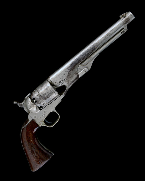 for 1863, with round 8in. barrel, the top signed 'ADDRESS COL SAML COLT NEW-YORK U.S. AMERICA', dove-tailed blade fore-sight, stepped cylinder with traces of a naval engagement scene, open frame, spurred hammer, iron back-strap, smooth walnut one-piece grip, brass trigger-guard and iron under-barrel rammer, the whole with much original nickel-plated finish (some frosting throughout)