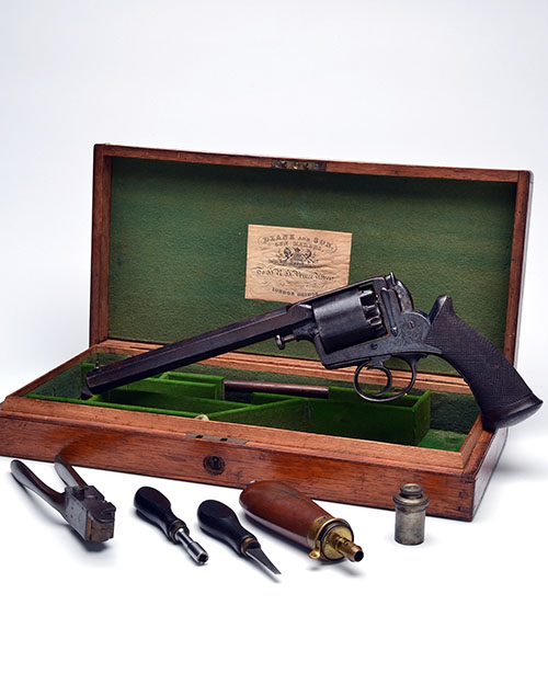 circa 1852, with octagonal 7 3/4in. barrel, the top-flat and strap signed 'DEANE ADAMS & DEANE (MAKERS TO HRH PRINCE ALBERT), 30 KING WILLIAM ST, LONDON BRIDGE', dove-tailed blade fore-sight, standing notch rear-sight to the back of top-strap, scroll engraving to the breech throat, plain cylinder, solid border and scroll engraved frame with spur-less hammer, finely chequered one-piece walnut grip with swollen pommel, iron butt-cap with engraved central cap-box and scroll engraved trigger-guard bow, the frame having traces of finish (now faded), some mild pitting to cylinder TOGETHER WITH its original manufacturers oak storage case, compartmented and relined in green baize, and containing an original brass Adam's patent bullet mould, a cleaning rod, oil bottle, turnscrew, nipple key and cap tin, the lid with parchment 'Deane and Son' trade label.