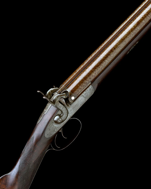 A 10-BORE PERCUSSION DOUBLE-BARRELLED SPORTING GUN, no visible serial number,