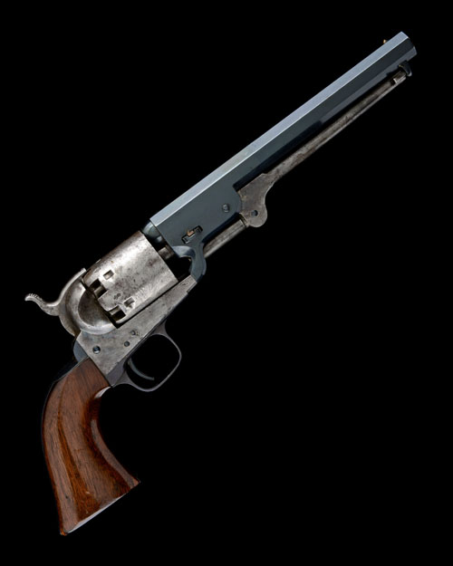 for 1855, with reblued octagonal 7 1/2in. barrel, the top-flat signed 'ADDRESS COL COLT LONDON', bead fore-sight, rear-sight notch to the hammer-nose, plain cylinder with roll-engraved naval engagement scene, iron open frame marked 'COLT'S PATENT', reblued iron grip-straps and trigger-guard, smooth walnut one-piece grip and hinged under-barrel rammer, some pitting to cylinder and frame
