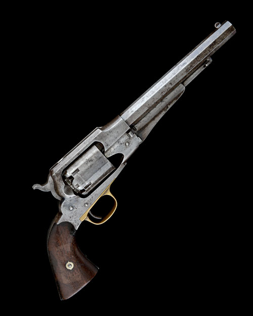 circa 1870, with 8in. octagonal barrel, the top-flat signed 'PATENTED SEPT 14 1858, E. REMINGTON & SONS, ILION, NEW YORK USA NEW MODEL', pillar fore-sight, sighting notch to the top-strap, plain cylinder, solid frame, smooth walnut grips, brass trigger-guard and hinged under-barrel rammer